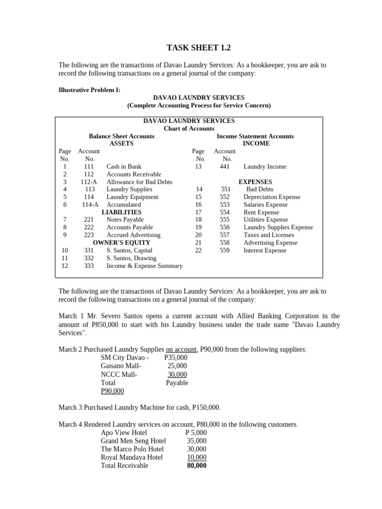 The following are the transactions of Davao Laundry Services: As a bookkeeper, you are ask to