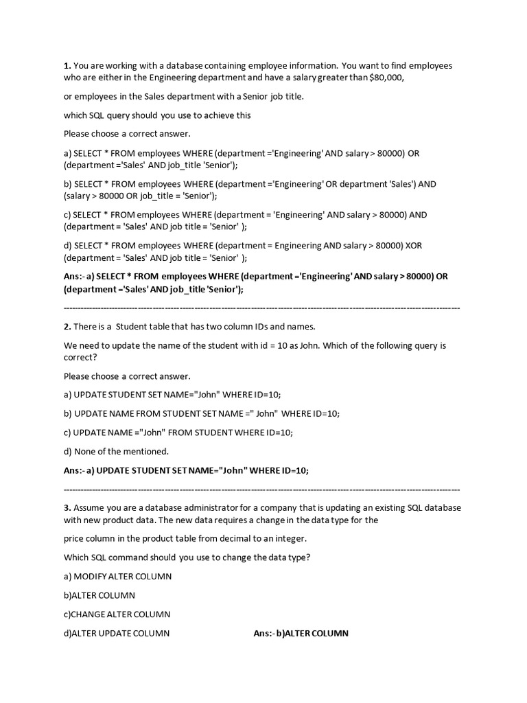 Ans:- a) SELECT * FROM employees WHERE (department ='Engineering' AND salary > 80000) OR