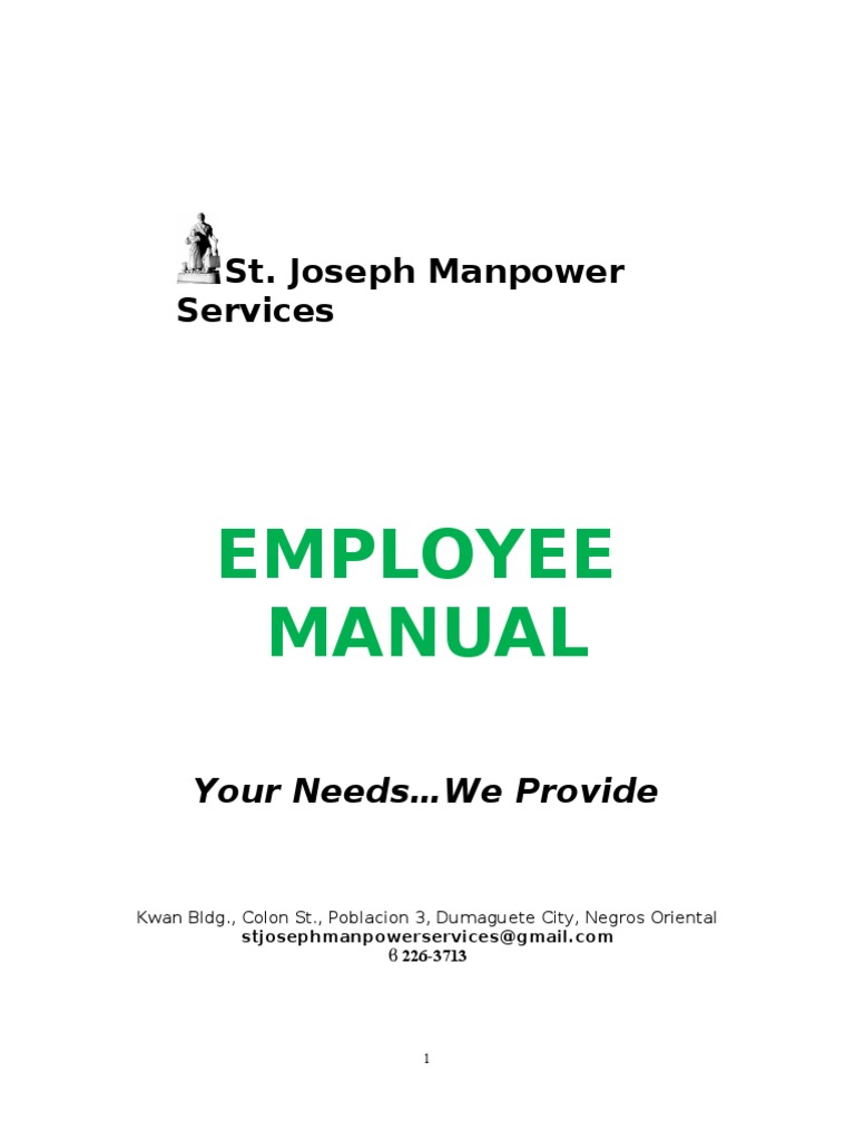 This Employee Manual is designed to fully acquaint you, our valued Employee, with St. Joseph Manpower Services (SJMS), your Company of value, and provide you with enough information about your working conditions, benefits, and policies directly affecting your employment. In brief, the information contained in this Manual applies to all employees of SJMS. This necessarily means that it applies to the Executive Committee as well as to the deployed personnel assigned and under contract with the clientele of SJMS although majority of the items and statements contained herein are more specifically intended for the latter than the former. The policies described in this Employee Manual are considered as strict conditions of continued employment. However, nothing in this Manual necessarily alters an employees status. The contents of this Manual shall not constitute nor be construed as a promise of employment or as a contract between SJMS and any of its employees. In a word, this Employee Manual is a summary of our agreed policies, which are presented here only as a matter of quality corporate information. You are personally responsible for reading, understanding, digesting, and complying with the provisions of this Employee Manual. Our working objective has always been to provide you with a work