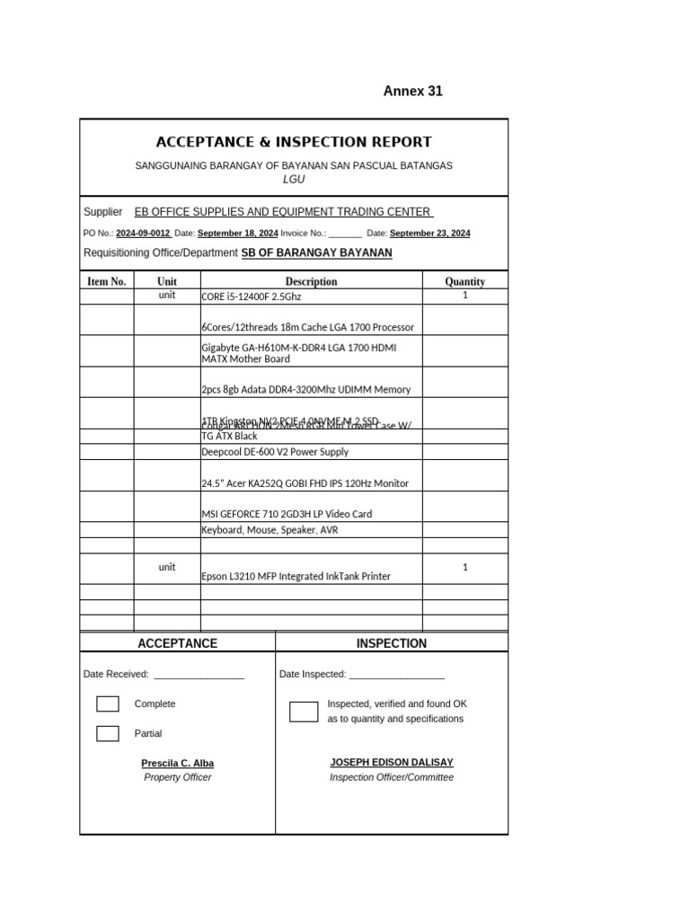 ACCEPTANCE & INSPECTION REPORT