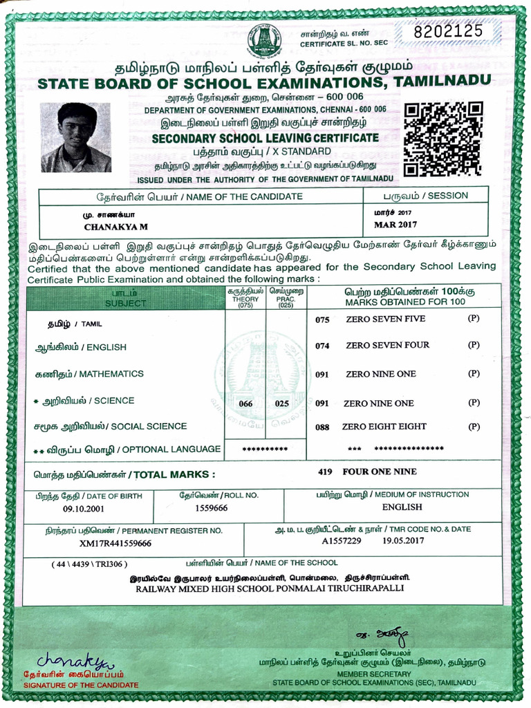 SIGNATURE OF THE CANDIDATE STATE BOARD OF SCHOOL EXAMINATIONS (SEC), TAMILNADU