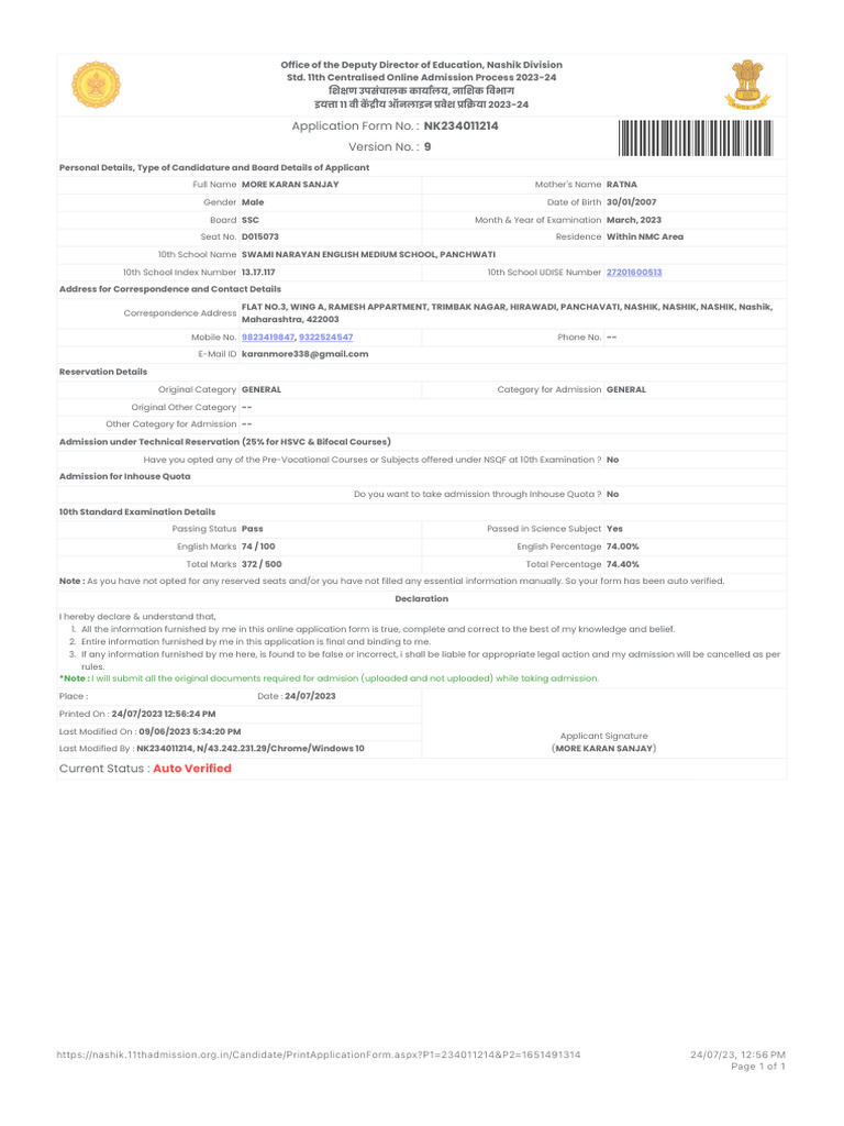 https://nashik.11thadmission.org.in/Candidate/PrintApplicationForm.aspx?P1=234011214&P2=1651491314 24/07/23, 12 56 PM