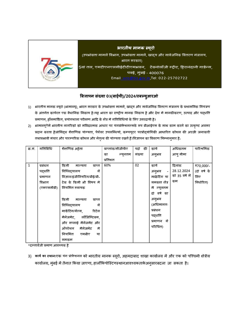 3. Job Location:One Young Professional shall be posted at Bureau of Indian Standards, Ahmedabad