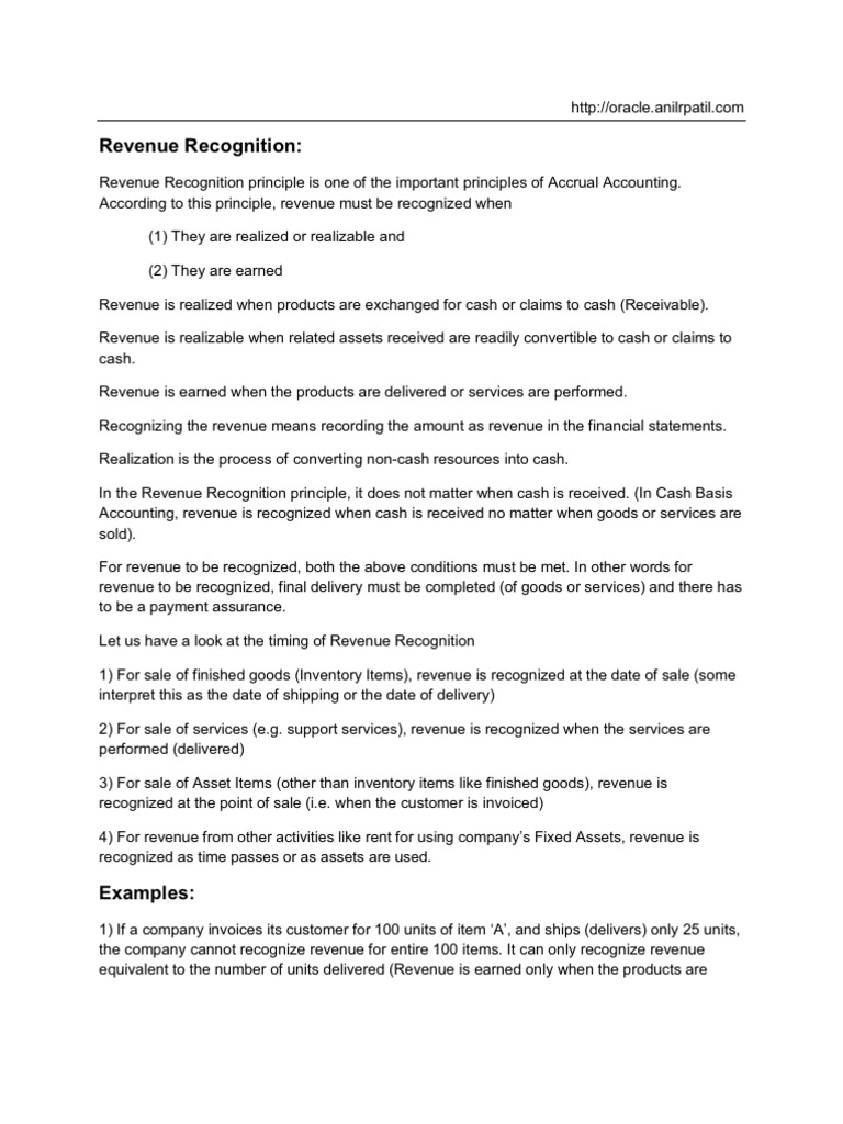 Revenue Recognition principle is one of the important principles of Accrual Accounting. According to this principle, revenue must be recognized when (1) They are realized or realizable and (2) They are earned Revenue is realized when products are exchanged for cash or claims to cash (Receivable). Revenue is realizable when related assets received are readily convertible to cash or claims to cash. Revenue is earned when the products are delivered or services are performed. Recognizing the revenue means recording the amount as revenue in the financial statements. Realization is the process of converting non-cash resources into cash. In the Revenue Recognition principle, it does not matter when cash is received. (In Cash Basis Accounting, revenue is recognized when cash is received no matter when goods or services are sold). For revenue to be recognized, both the above conditions must be met. In other words for revenue to be recognized, final delivery must be completed (of goods or services) and there has to be a payment assurance. Let us have a look at the timing of Revenue Recognition 1) For sale of finished goods (Inventory Items), revenue is recognized at the date of sale (some interpret this as the date of shipping or the date of delivery) 2) For sale of services (e.g. support services), revenue is recognized when the services are performed (delivered) 3) For sale of Asset Items (other than inventory items like finished goods), revenue is recognized at the point of sale (i.e. when the customer is invoiced) 4) For revenue from other activities like rent for using companys Fixed Assets, revenue is recognized as time passes or as assets are used.
