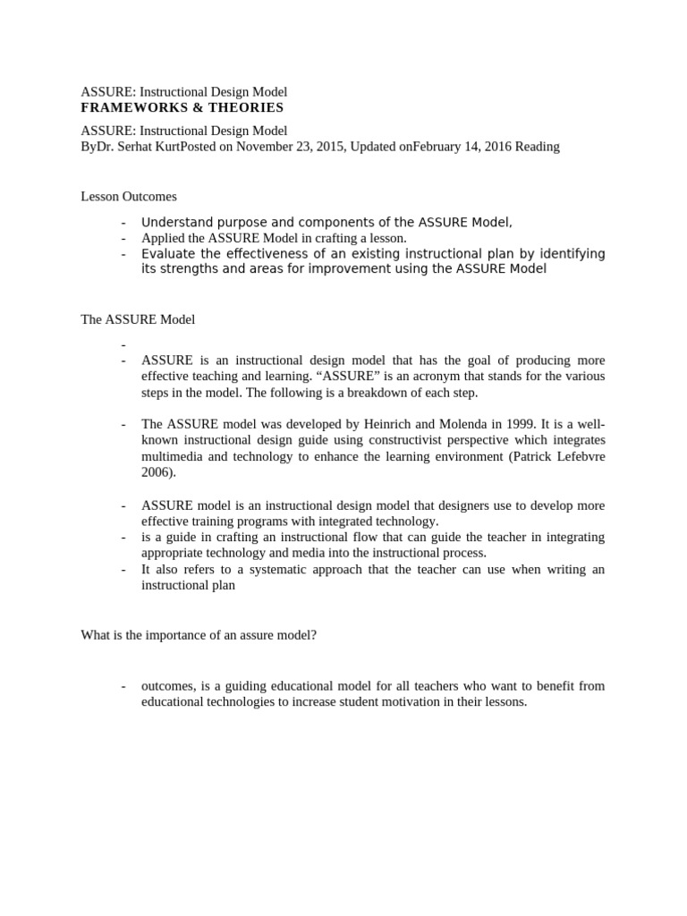 - The ASSURE model was developed by Heinrich and Molenda in 1999. It is a well-