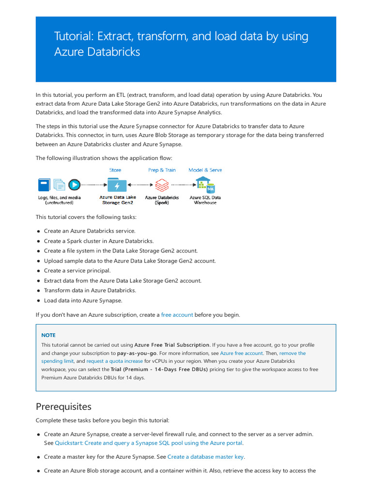 In this tutorial, you perform an ETL (extract, transform, and load data) operation by using Azure Databricks. You