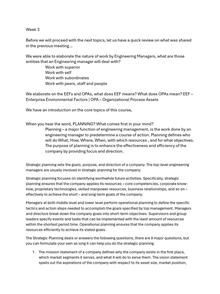 Strategic planning sets the goals, purpose, and direction of a company. The top-level engineering
