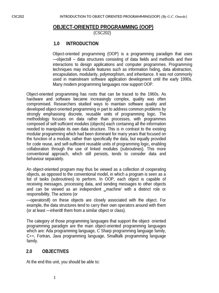 CSC202 INTRODUCTION TO OBJECT-ORIENTED PROGRAMMING [By G.C. Omede]