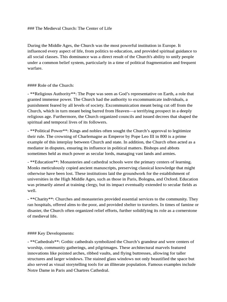 - **Cathedrals**: Gothic cathedrals symbolized the Church’s grandeur and were centers of