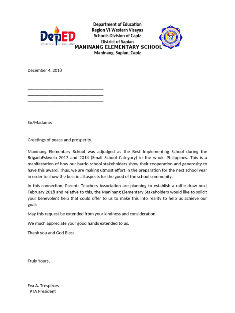 February 2018 and relative to this, the Maninang Elementary Stakeholders would like to solicit