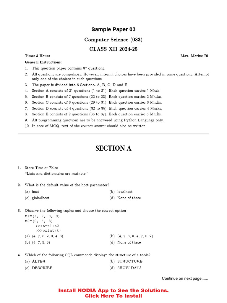 CBSC 12th Computer Science Sample Paper 03 Page 1