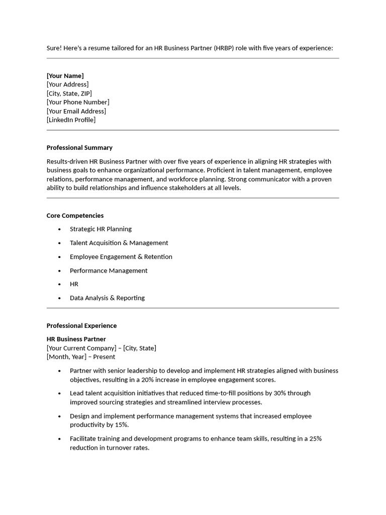 Here’s a resume tailored for an HR Business Partner (HRBP) role with five years of experience: