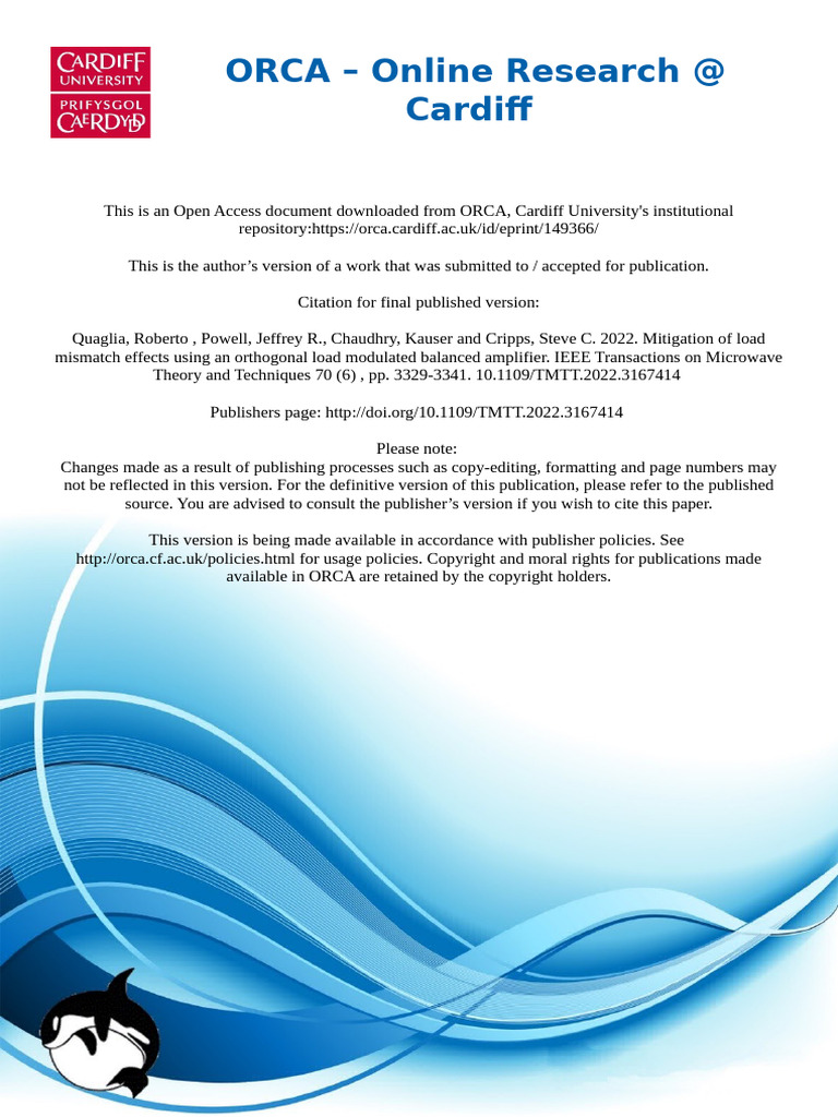 mismatch effects using an orthogonal load modulated balanced amplifier. IEEE Transactions on Microwave