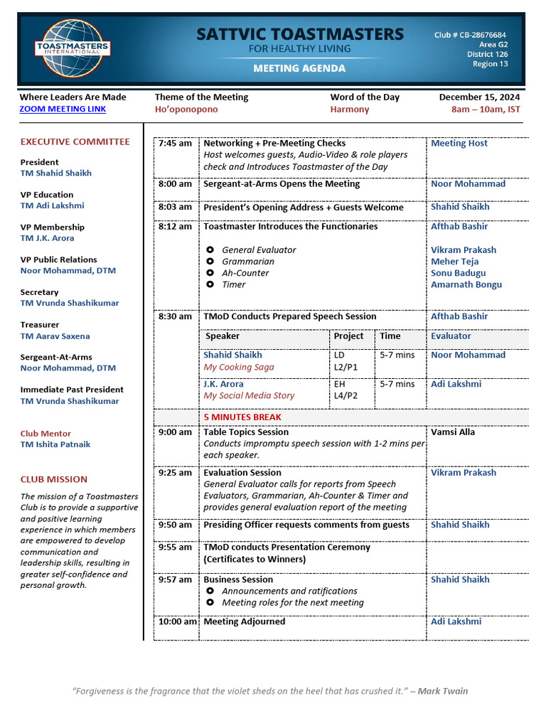 VP Membership 8:12 am Toastmaster Introduces the Functionaries Afthab Bashir
