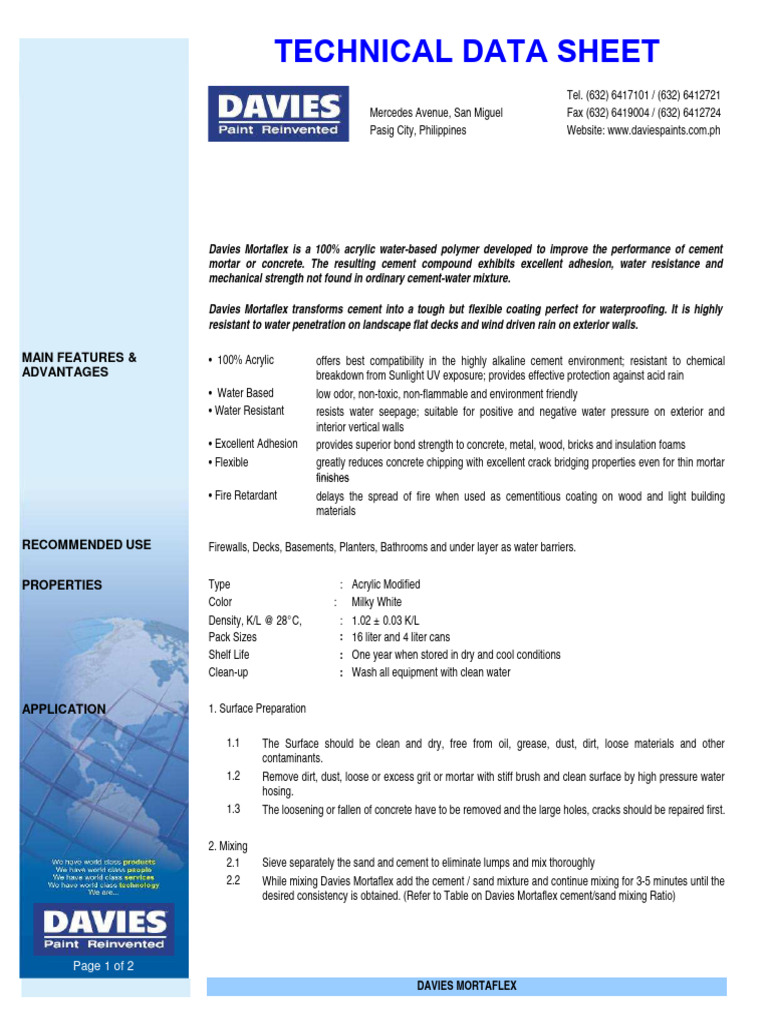DESCRIPTION Davies Mortaflex is a 100% acrylic water-based polymer developed to improve the performance of cement