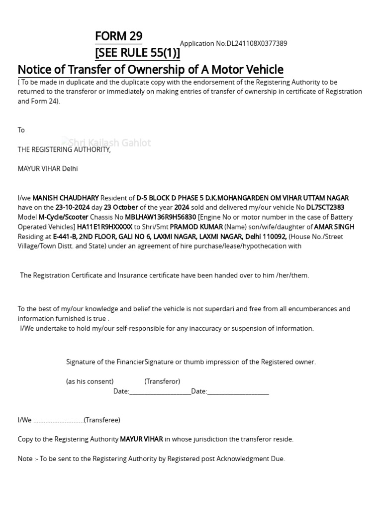 Copy to the Registering Authority MAYUR VIHAR in whose jurisdiction the transferor reside.