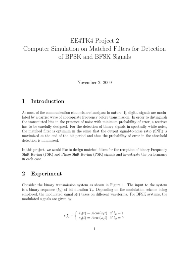 In this project, we would like to design matched filters for the reception of binary Frequency