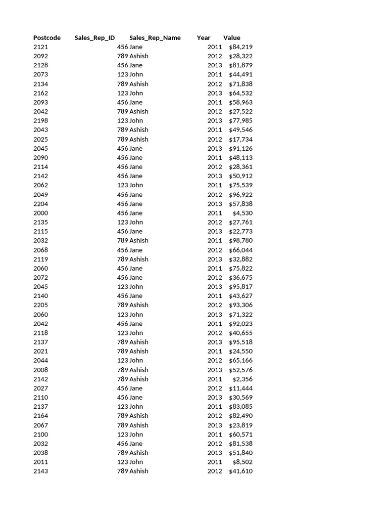 Postcode Sales_Rep_ID Sales_Rep_Name Year Value