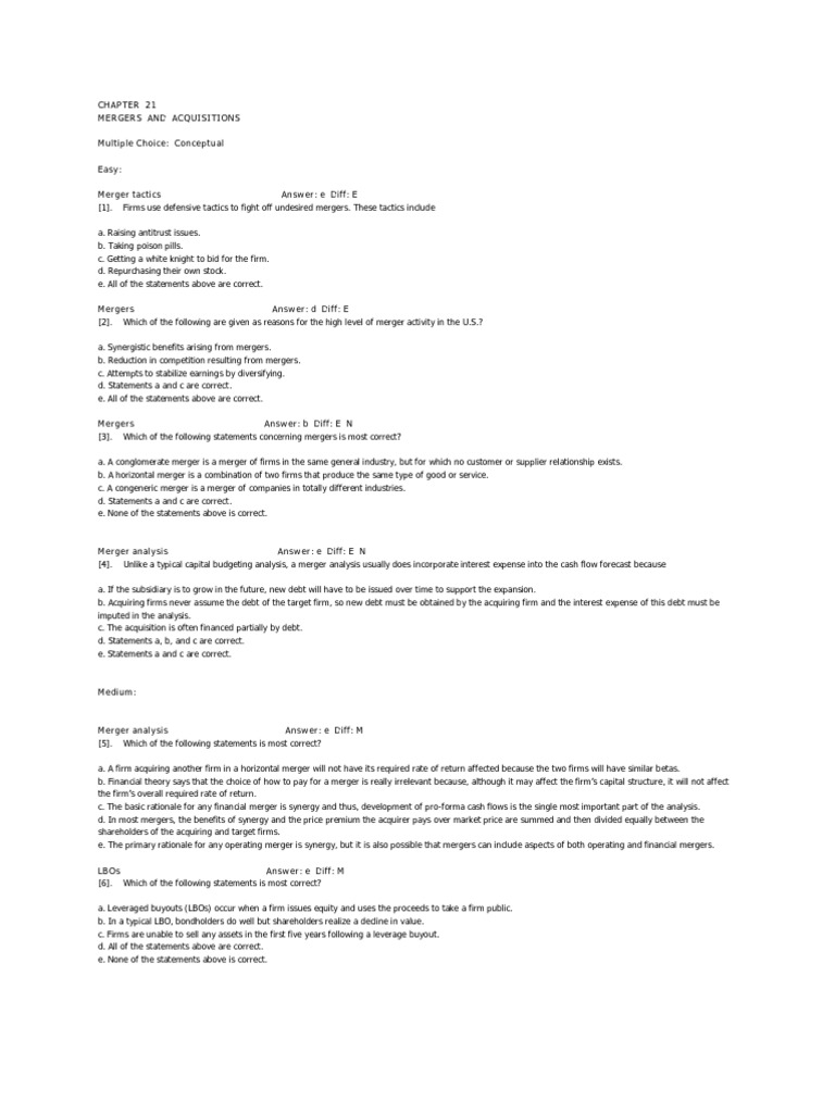 Merger analysis Answer: e Diff: M [5]. Which of the following statements is most correct? a. A firm acquiring another firm in a horizontal merger will not have its required rate of return affected because the two firms will have similar betas. b. Financial theory says that the choice of how to pay for a merger is really irrelevant because, although it may affect the firm s capital structure, it will not affect the firm s overall required rate of return. c. The basic rationale for any financial merger is synergy and thus, development of pro-forma cash flows is the single most important part of the analysis. d. In most mergers, the benefits of synergy and the price premium the acquirer pays over market price are summed and then divided equally between the shareholders of the acquiring and target firms. e. The primary rationale for any operating merger is synergy, but it is also possible that mergers can include aspects of both operating and financial mergers. LBOs Answer: e Diff: M [6]. Which of the following statements is most correct? a. Leveraged buyouts (LBOs) occur when a firm issues equity and uses the proceeds to take a firm public. b. In a typical LBO, bondholders do well but shareholders realize a decline in value. c. Firms are unable to sell any assets in the first five years following a leverage buyout. d. All of the statements above are correct. e. None of the statements above is correct.