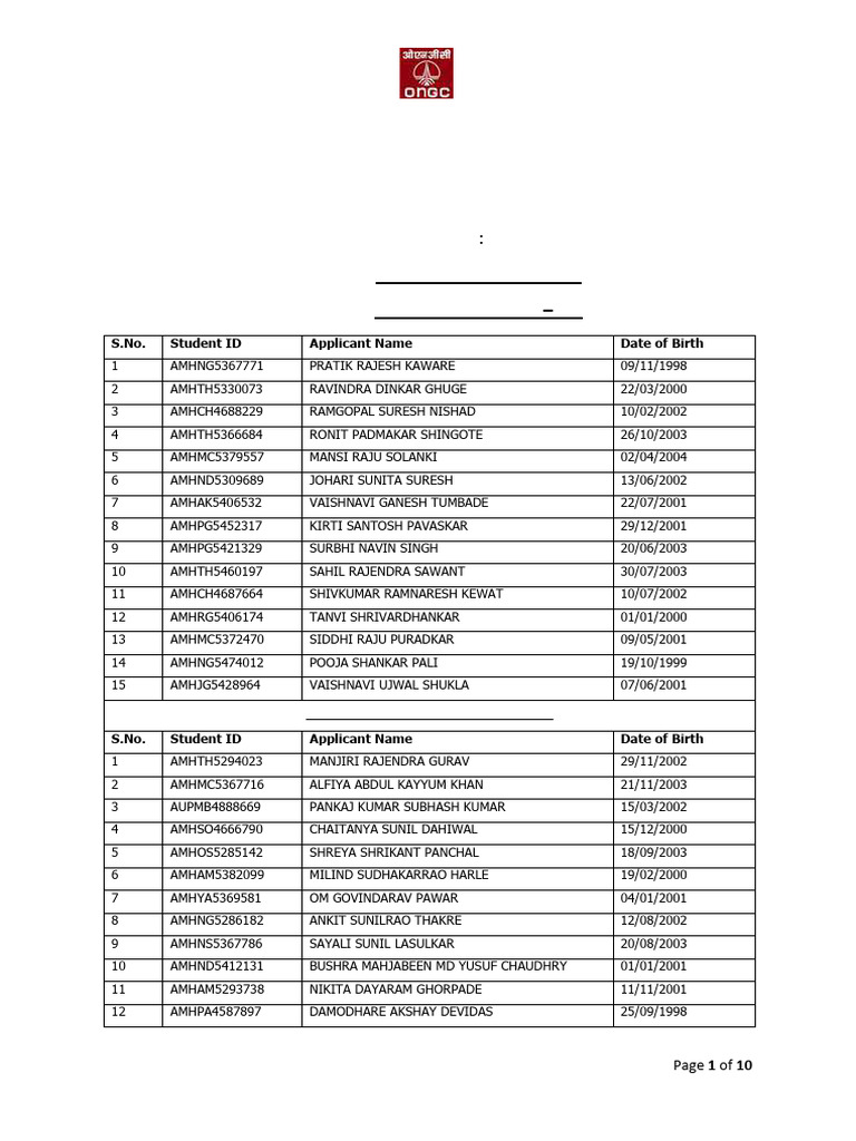 S.No. Student ID Applicant Name Date of Birth