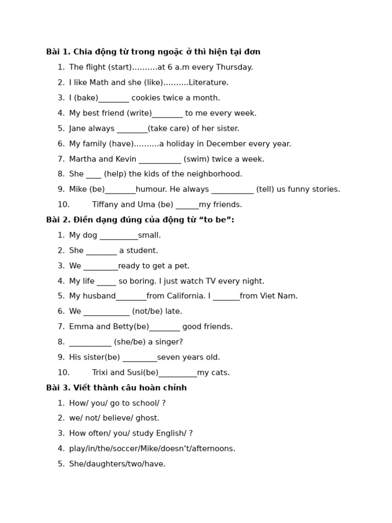 Bài 1. Cho dạng đúng của động từ trong ngoặc ở thì hiện tại đơn