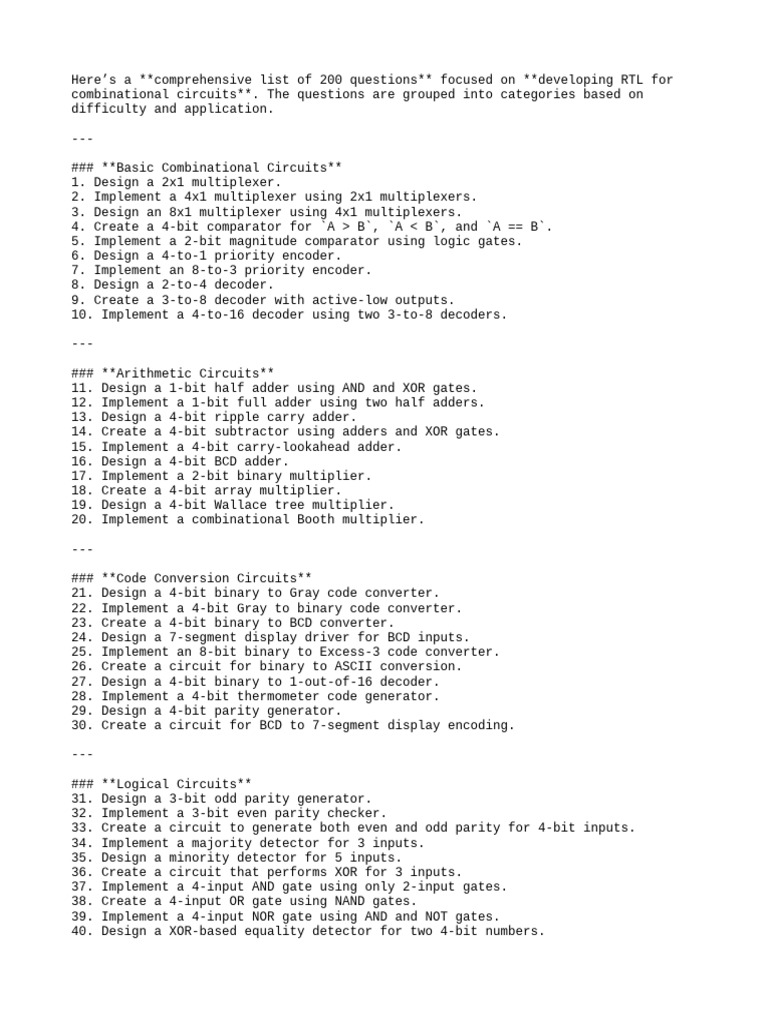 Here’s a **comprehensive list of 200 questions** focused on **developing RTL for