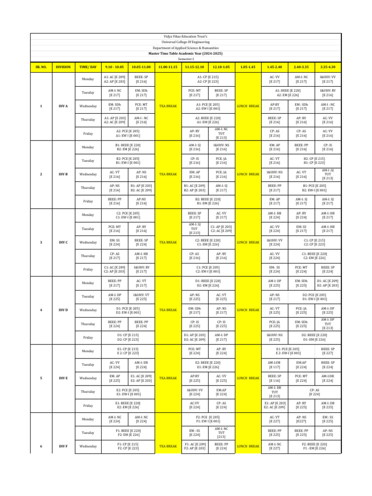 SR. NO. DIVISION TIME/ DAY 9.10 - 10.05 10.05-11.00 11.00-11.15 11.15-12.10 12.10-1.05 1.05-1.45 1.45-2.40 2.40-3.35 3.35-4.30