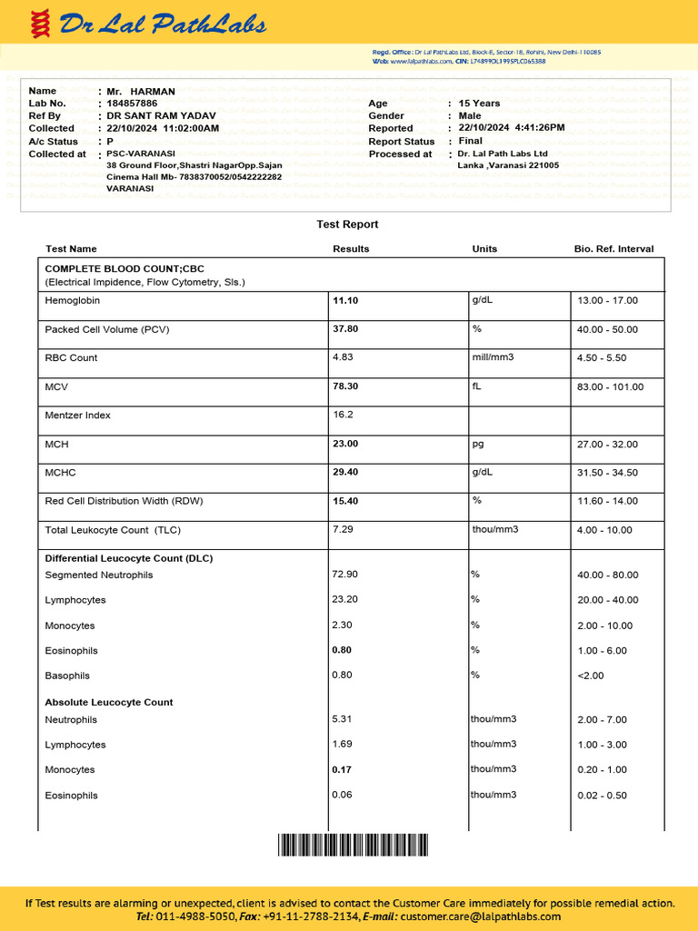 Collected at : PSC-VARANASI Processed at : Dr. Lal Path Labs Ltd