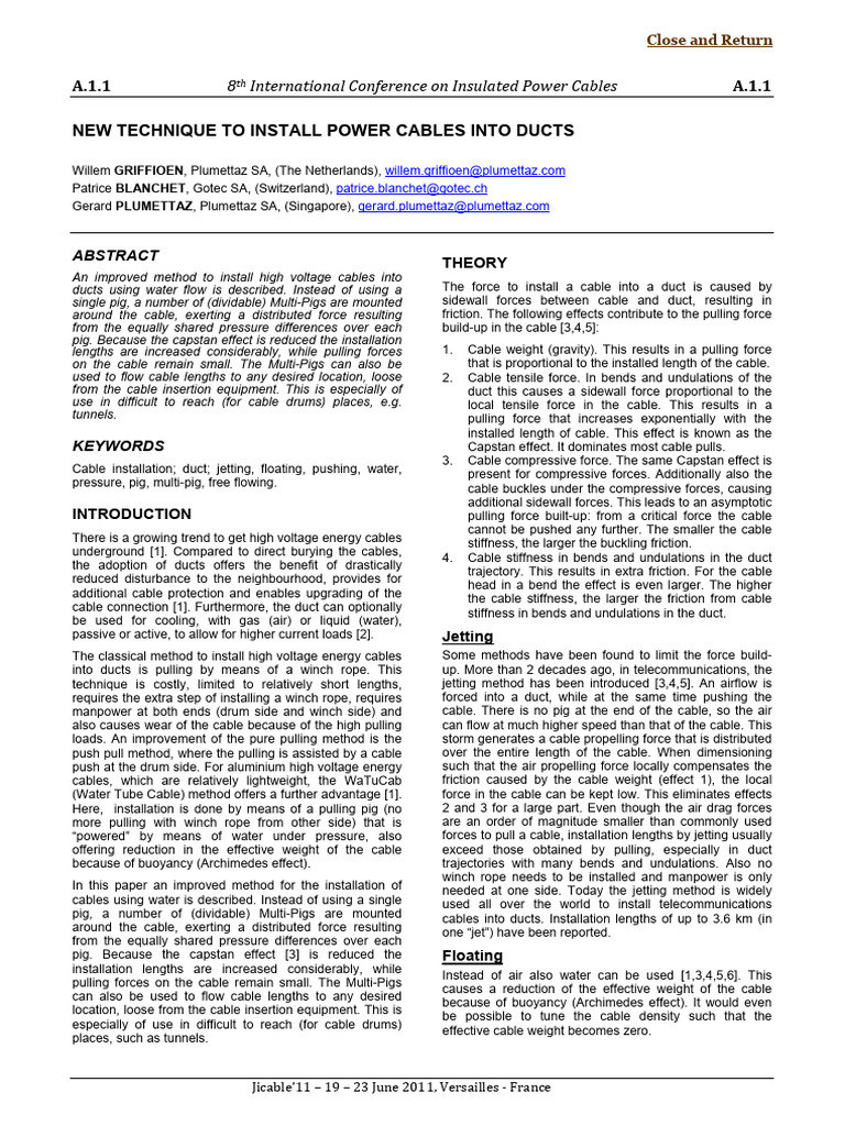 Cable (mm) Duct ID (mm) Distance (km) [1] G. Plumettaz, J. Heinonen, 2009, "High voltage