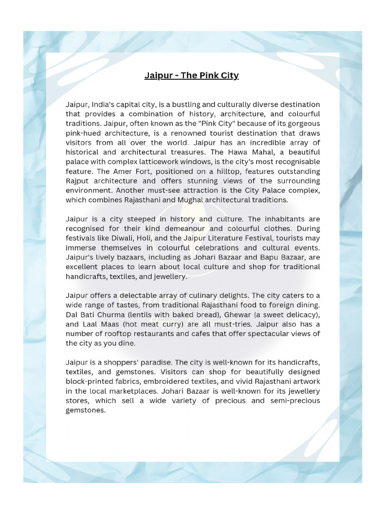 traditions. Jaipur, often known as the "Pink City" because of its gorgeous