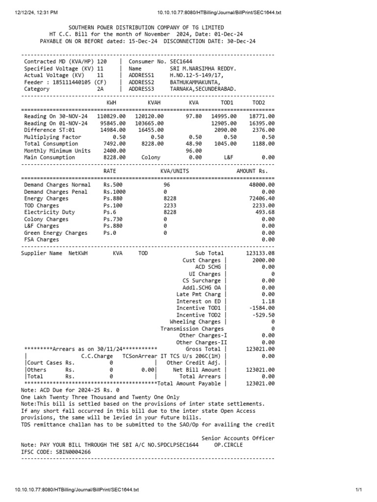 Contracted MD (KVA/HP) 120 | Consumer No. SEC1644