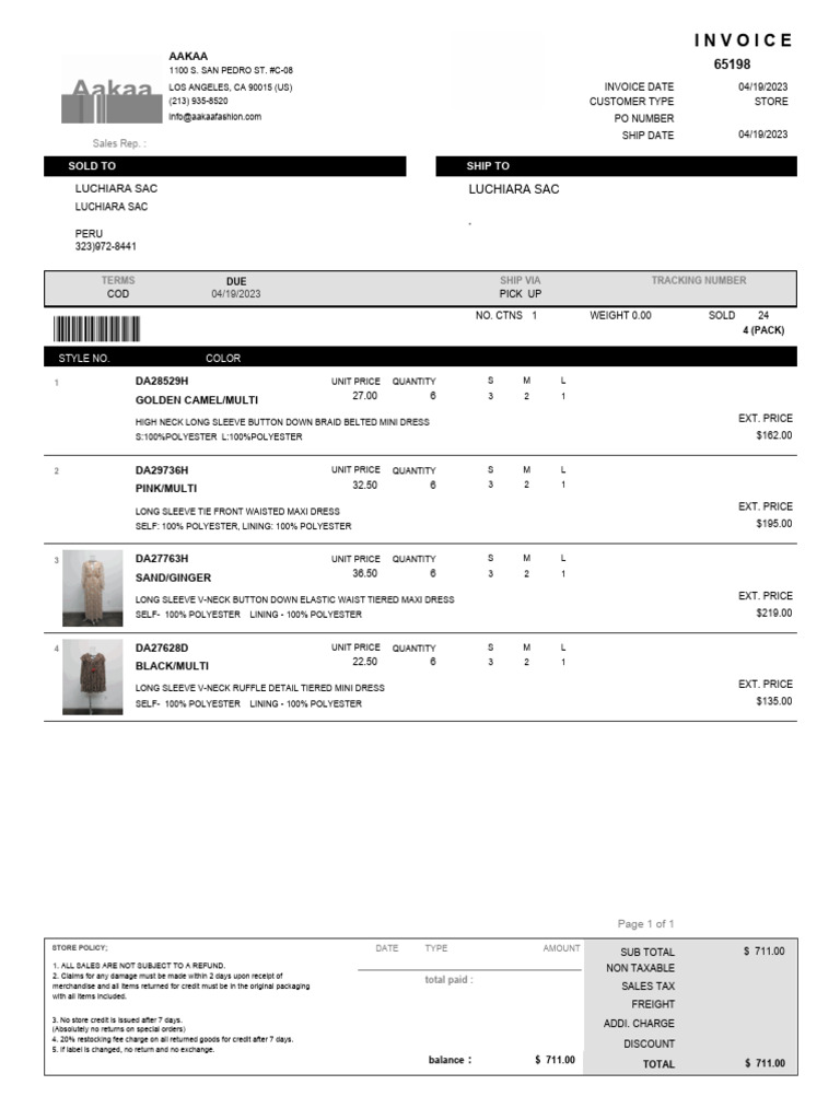 STORE POLICY; DATE TYPE AMOUNT SUB TOTAL $ 711.00