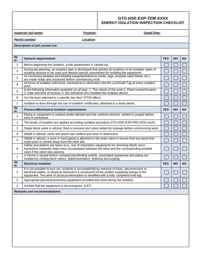 ENERGY ISOLATION INSPECTION CHECKLIST
