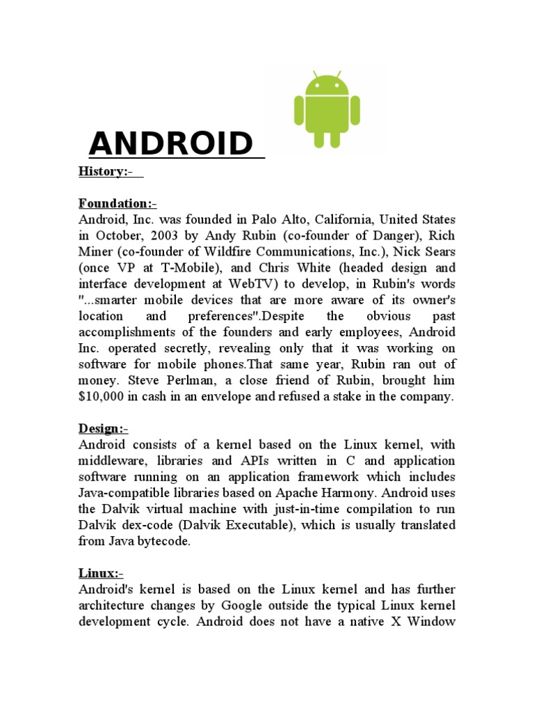 History:Foundation:Android, Inc. was founded in Palo Alto, California, United States in October, 2003 by Andy Rubin (co-founder of Danger), Rich Miner (co-founder of Wildfire Communications, Inc.), Nick Sears (once VP at T-Mobile), and Chris White (headed design and interface development at WebTV) to develop, in Rubin's words "...smarter mobile devices that are more aware of its owner's location and preferences".Despite the obvious past accomplishments of the founders and early employees, Android Inc. operated secretly, revealing only that it was working on software for mobile phones.That same year, Rubin ran out of money. Steve Perlman, a close friend of Rubin, brought him $10,000 in cash in an envelope and refused a stake in the company. Design:Android consists of a kernel based on the Linux kernel, with middleware, libraries and APIs written in C and application software running on an application framework which includes Java-compatible libraries based on Apache Harmony. Android uses the Dalvik virtual machine with just-in-time compilation to run Dalvik dex-code (Dalvik Executable), which is usually translated from Java bytecode. Linux:Android's kernel is based on the Linux kernel and has further architecture changes by Google outside the typical Linux kernel development cycle. Android does not have a native X Window