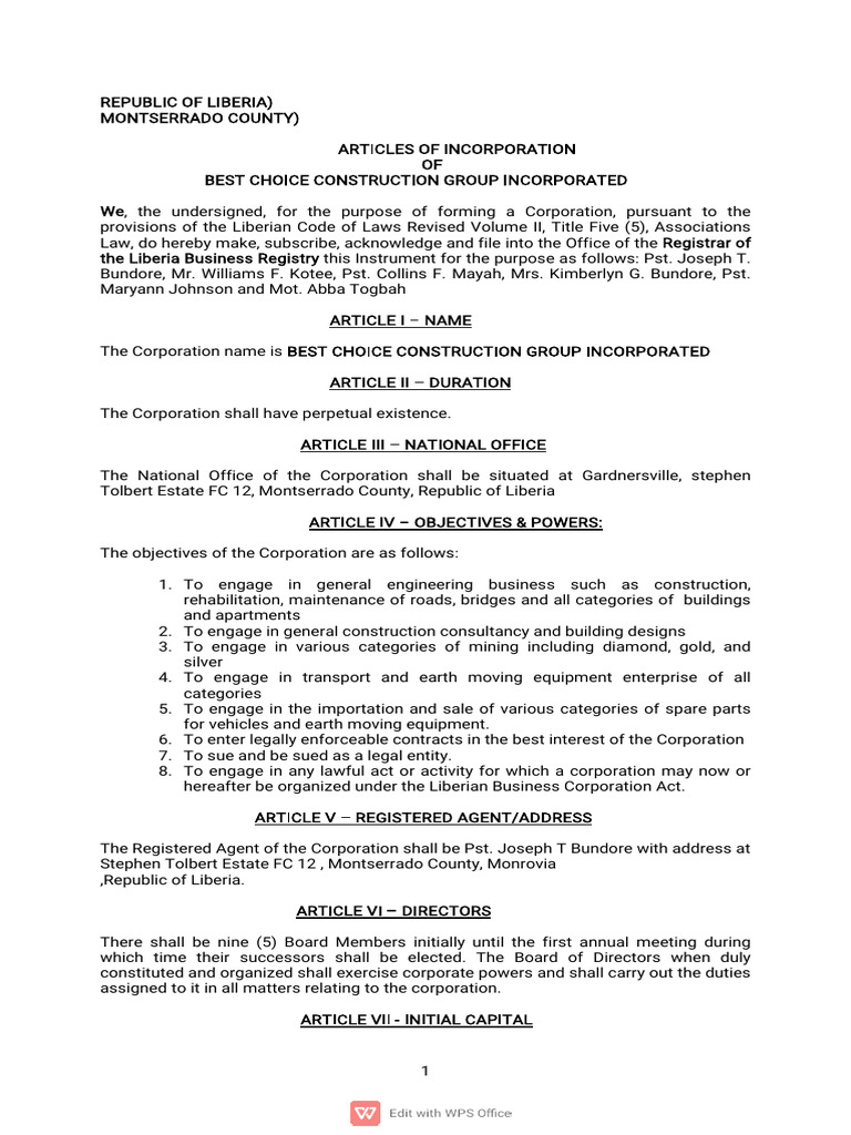 the Liberia Business Registry this Instrument for the purpose as follows: Pst. Joseph T.