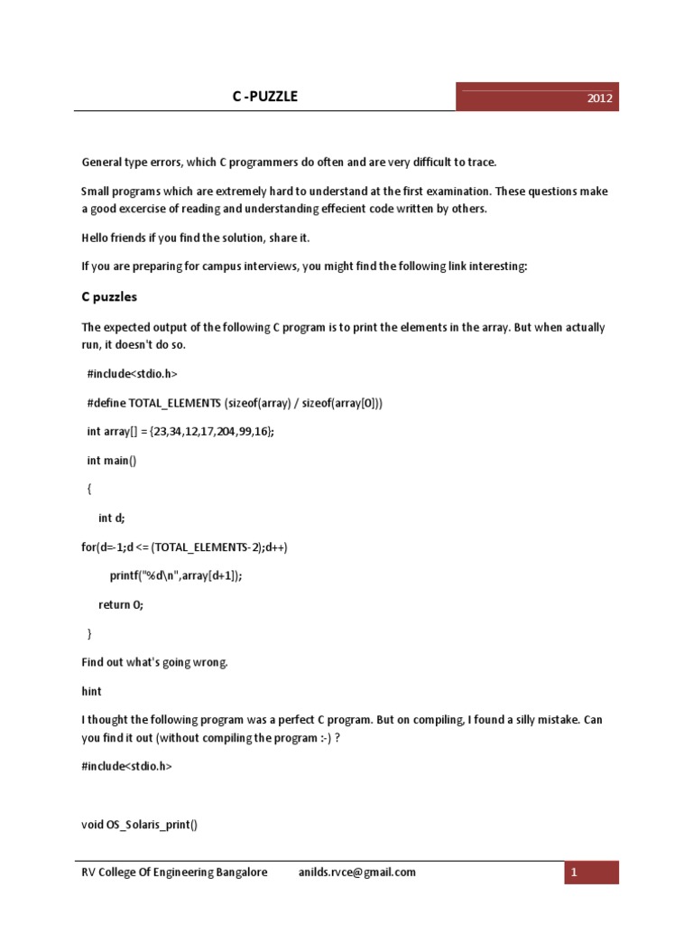 Well fixing the above code is straight-forward. To make the problem interesting, you have to fix the above code, by changing exactly one character. There are three known solutions. See if you can get all those three. What's the mistake in the following code? #include <stdio.h> int main() { int* ptr1,ptr2; ptr1 = malloc(sizeof(int)); ptr2 = ptr1; *ptr2 = 10; return 0; } What is the output of the following program? #include <stdio.h> int main() { RV College Of Engineering Bangalore anilds.rvce@gmail.com 25