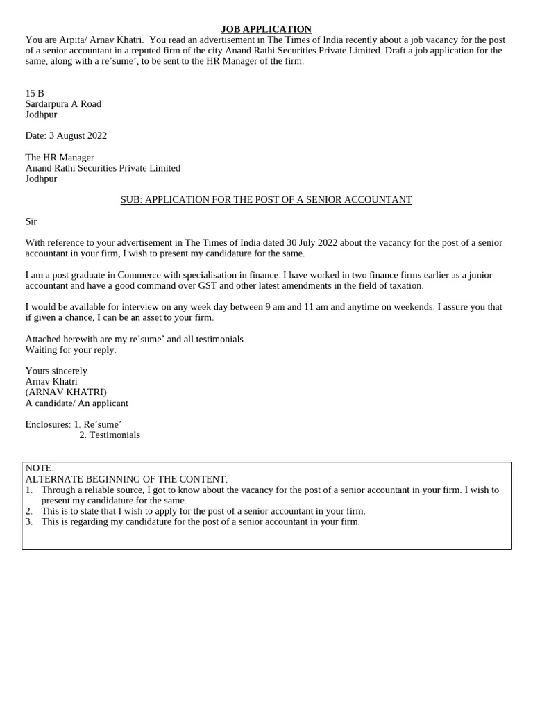 You are Arpita/ Arnav Khatri. You read an advertisement in The Times of India recently about a job vacancy for the post