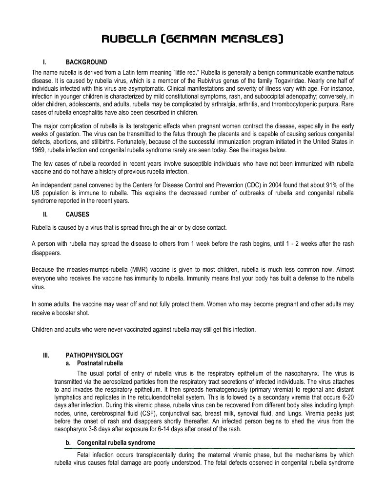 I. BACKGROUND The name rubella is derived from a Latin term meaning "little red." Rubella is generally a benign communicable exanthematous disease. It is caused by rubella virus, which is a member of the Rubivirus genus of the family Togaviridae. Nearly one half of individuals infected with this virus are asymptomatic. Clinical manifestations and severity of illness vary with age. For instance, infection in younger children is characterized by mild constitutional symptoms, rash, and suboccipital adenopathy; conversely, in older children, adolescents, and adults, rubella may be complicated by arthralgia, arthritis, and thrombocytopenic purpura. Rare cases of rubella encephalitis have also been described in children. The major complication of rubella is its teratogenic effects when pregnant women contract the disease, especially in the early weeks of gestation. The virus can be transmitted to the fetus through the placenta and is capable of causing serious congenital defects, abortions, and stillbirths. Fortunately, because of the successful immunization program initiated in the United States in 1969, rubella infection and congenital rubella syndrome rarely are seen today. See the images below. The few cases of rubella recorded in recent years involve susceptible individuals who have not been immunized with rubella vaccine and do not have a history of previous rubella infection. An independent panel convened by the Centers for Disease Control and Prevention (CDC) in 2004 found that about 91% of the US population is immune to rubella. This explains the decreased number of outbreaks of rubella and congenital rubella syndrome reported in the recent years. II. CAUSES