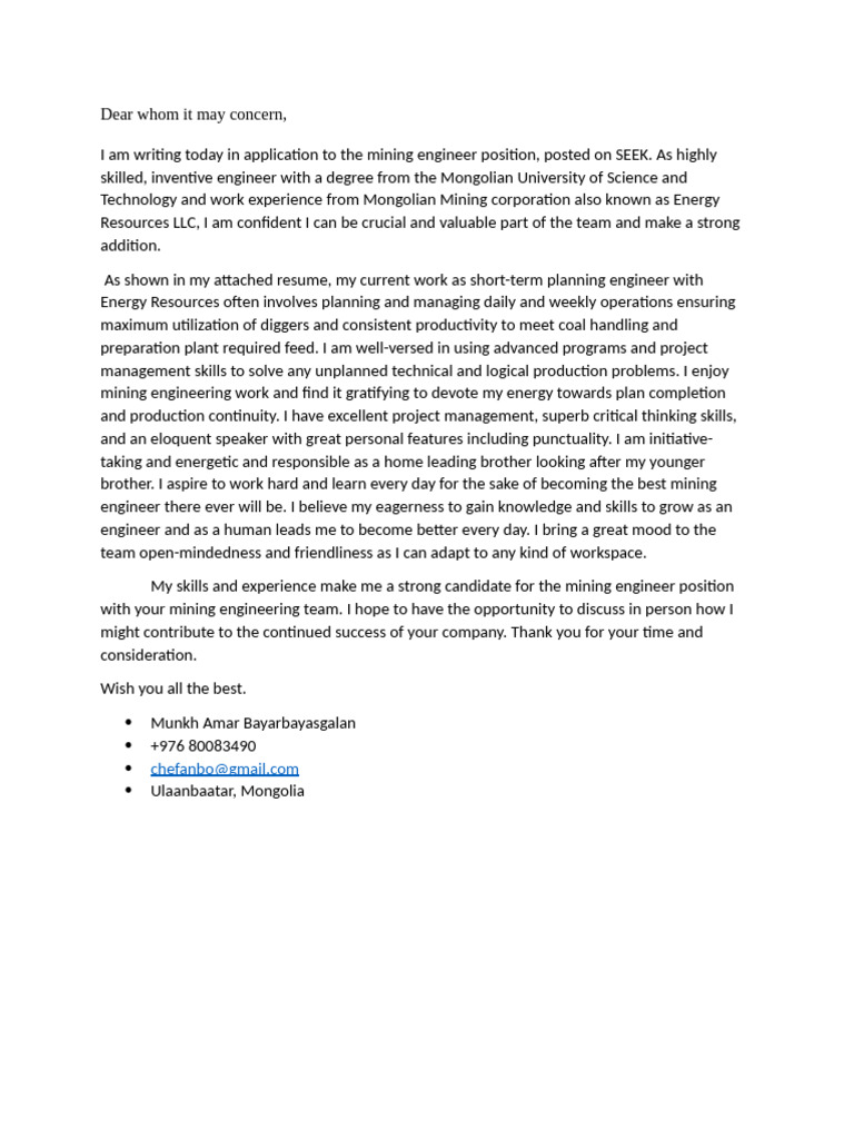 I am writing today in application to the mining engineer position, posted on SEEK. As highly