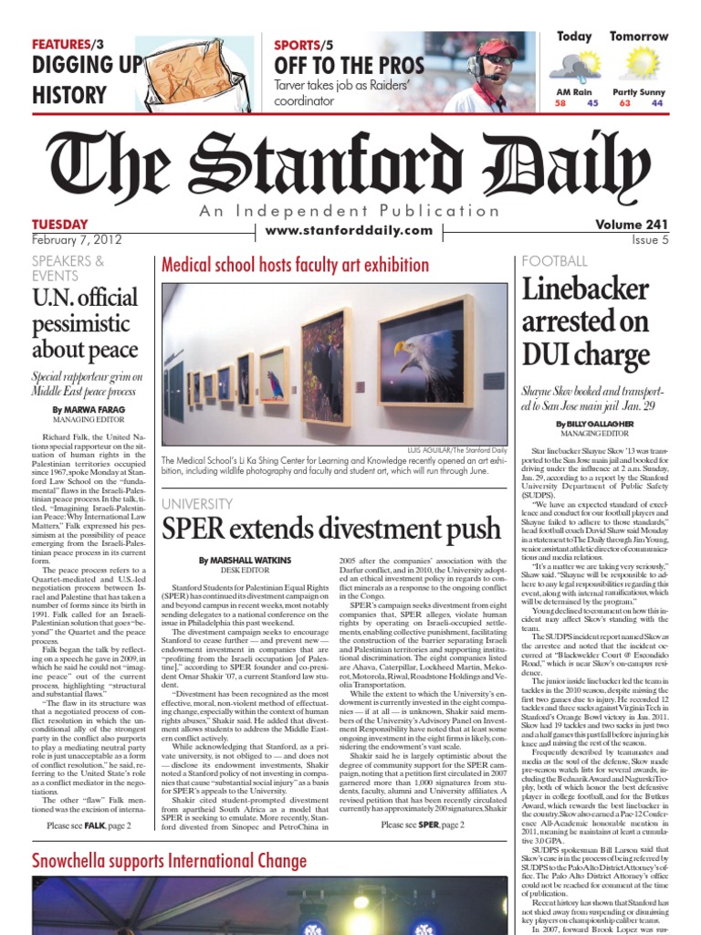 Stanford Students for Palestinian Equal Rights (SPER) has continued its divestment campaign on and beyond campus in recent weeks, most notably sending delegates to a national conference on the issue in Philadelphia this past weekend. The divestment campaign seeks to encourage Stanford to cease further and prevent new endowment investment in companies that are profiting from the Israeli occupation [of Palestine], according to SPER founder and co-president Omar Shakir 07, a current Stanford law student. Divestment has been recognized as the most effective, moral, non-violent method of effectuating change, especially within the context of human rights abuses, Shakir said. He added that divestment allows students to address the Middle Eastern conflict actively. While acknowledging that Stanford, as a private university, is not obliged to and does not disclose its endowment investments, Shakir noted a Stanford policy of not investing in companies that cause substantial social injury as a basis for SPERs appeals to the University. Shakir cited student-prompted divestment from apartheid South Africa as a model that SPER is seeking to emulate. More recently, Stanford divested from Sinopec and PetroChina in