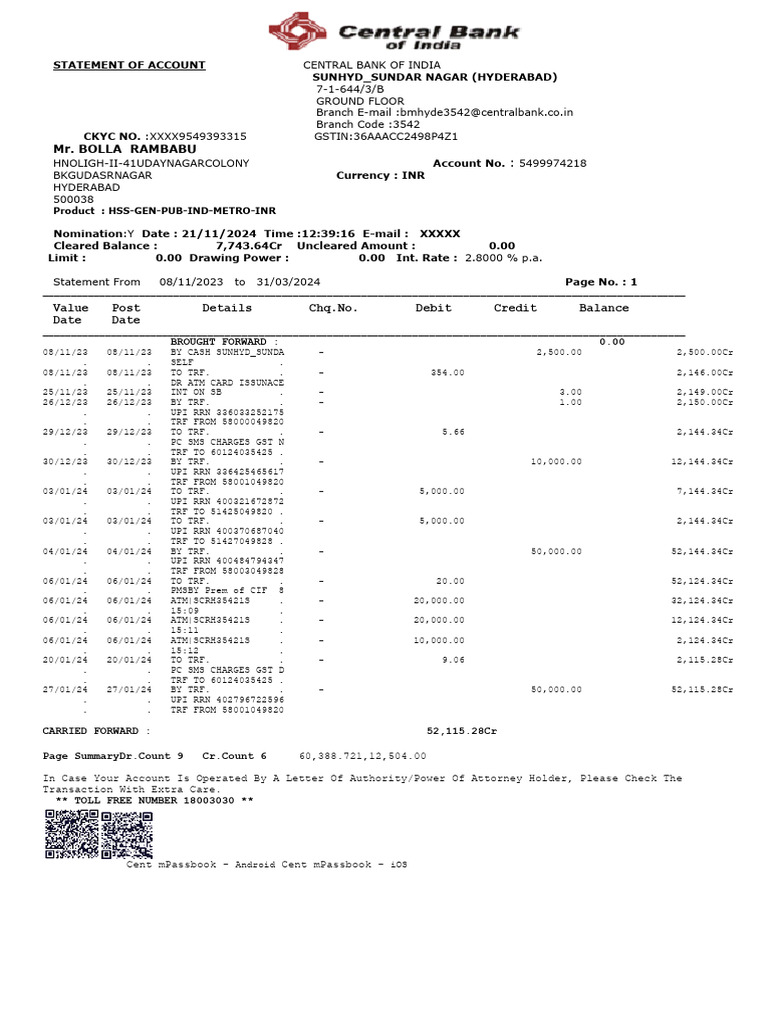 27/01/24 27/01/24 BY TRF. . - 50,000.00 52,115.28Cr