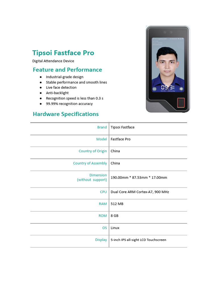 Live Face Detection Yes (0.3 - 1.5m)