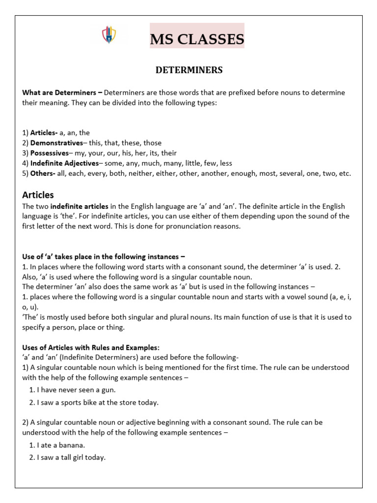 What are Determiners – Determiners are those words that are prefixed before nouns to determine