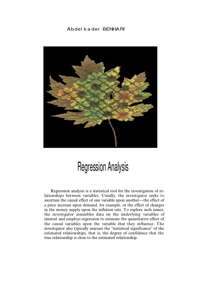 Regression analysis is a statistical tool for the investigation of relationships between variables. Usually, the investigator seeks to ascertain the causal eect of one variable upon anotherthe eect of a price increase upon demand, for example, or the eect of changes in the money supply upon the ination rate. To explore such issues, the investigator assembles data on the underlying variables of interest and employs regression to estimate the quantitative eect of the causal variables upon the variable that they inuence. The investigator also typically assesses the statistical signicance of the estimated relationships, that is, the degree of condence that the true relationship is close to the estimated relationship.