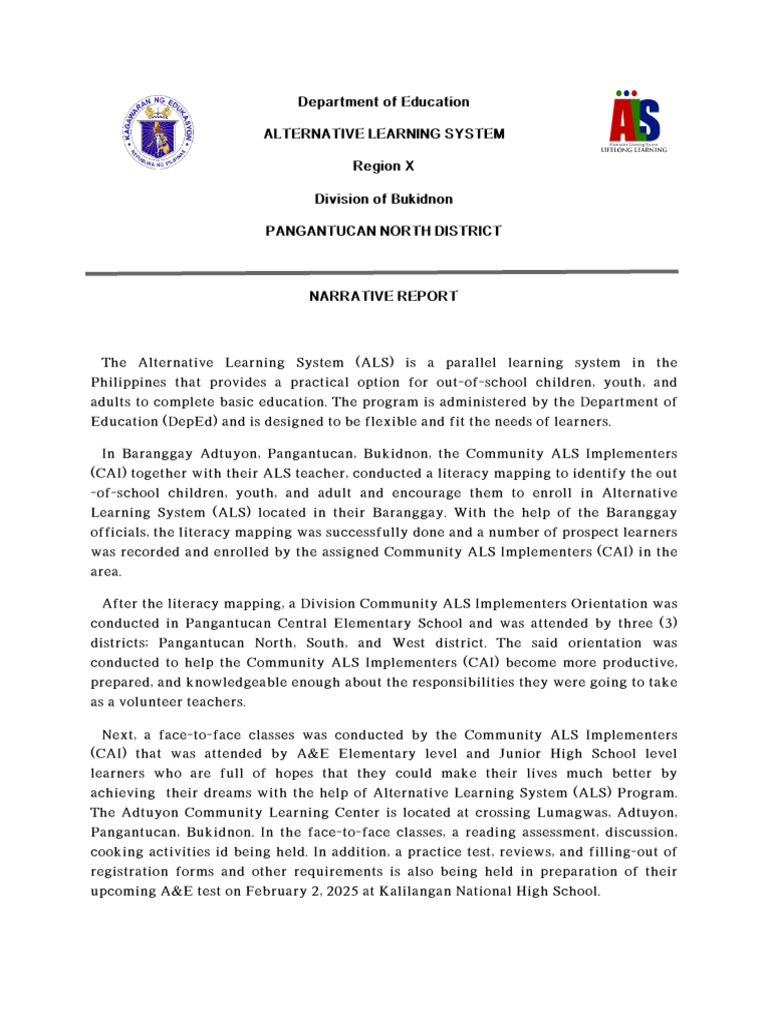 Learning System (ALS) located in their Baranggay. With the help of the Baranggay