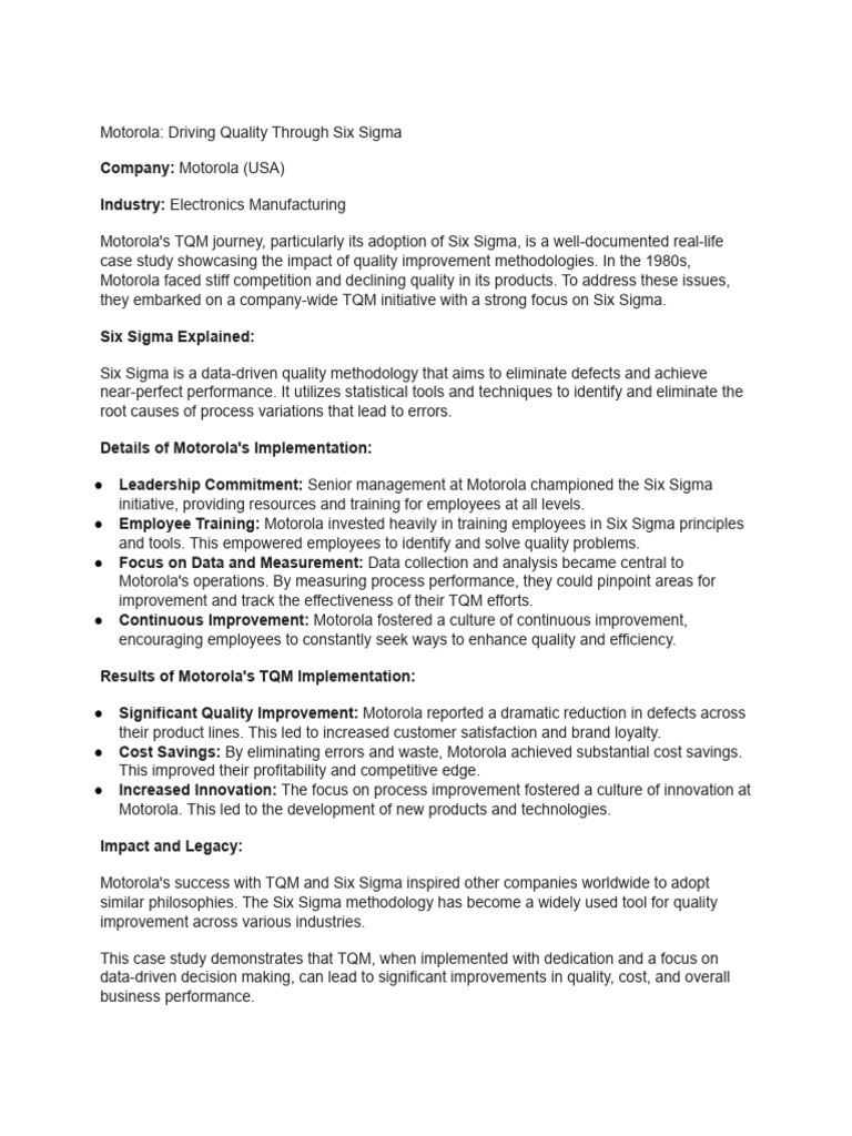 Motorola's TQM journey, particularly its adoption of Six Sigma, is a well-documented real-life