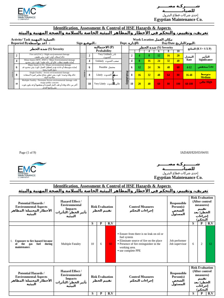 Environmental Aspects Risk Evaluation Control Measures Person(s)
