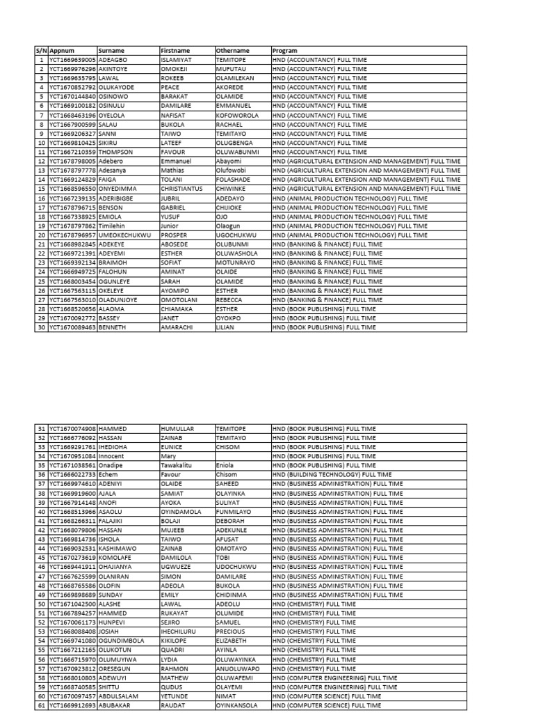 S/N Appnum Surname Firstname Othername Program