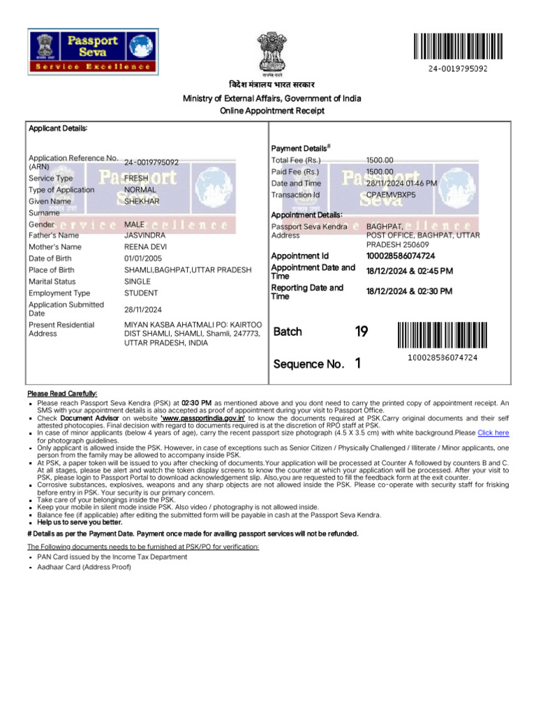 Gender MALE Passport Seva Kendra BAGHPAT,
