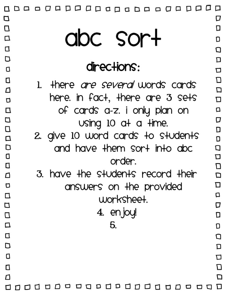 1. There are SEVERAL WORDS CARDS HERE. In fact, there are 3 sets of cards A-Z. I only plan on using 10 at a time. 2. Give 10 word cards to students and have them sort into ABC order. 3. Have the students record their answers on the provided worksheet. 4. Enjoy! 5.